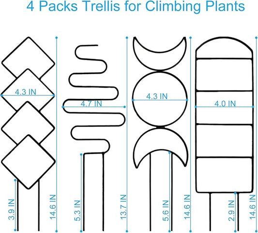 4 Packs Trellis for Climbing Plants Indoor, HENABLE Small Garden Metal Trellis for Potted Plants Outdoor for Vine Ivy Flower Plant Support, 4 Different Black Iron Patterns