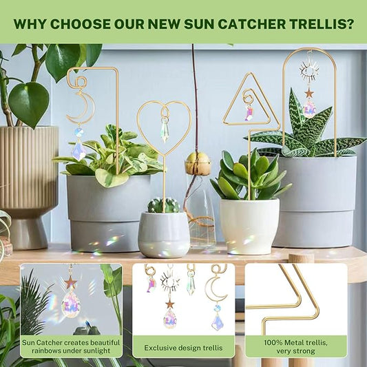 Small Trellis for Potted Plants Indoor with Colorful Crystal Sun Catcher, 14.17 Inch Metal Plant Lattice for Mini Potted Plant Decoration for Home Window Garden 4 Pack