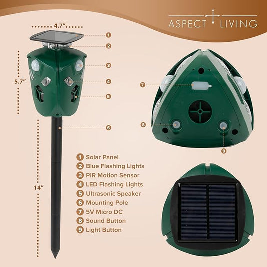 Solar-Powered Ultrasonic Animal Repellent with Motion Sensor, Waterproof Deer Repellent Device with LED Flashing Lights, Perfect for Outdoor Yards, Effective to Repel Deer, Coyotes, Raccoons, and Cats
