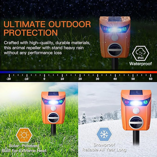 Solar Ultrasonic Animal Repeller Outdoor – Motion Sensor Activated Deer Repellent with Flashing Lights & Sound, IP65 Waterproof, Deterrent for Cats, Dogs, Raccoons, Skunks, Birds