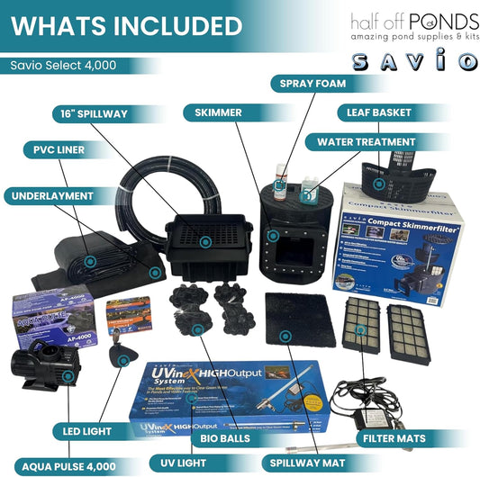 HALF OFF PONDS Savio Select 4,000 GPH Submersible Pump Pond Kit with 10' x 15' EPDM Rubber Pond Liner, UV Clarifier for Water Garden & Koi Pond