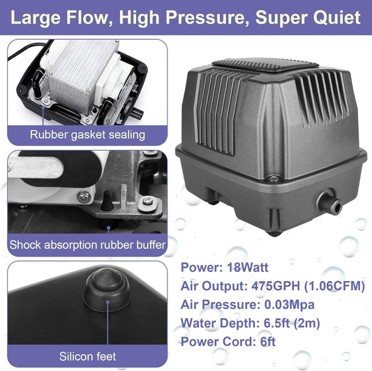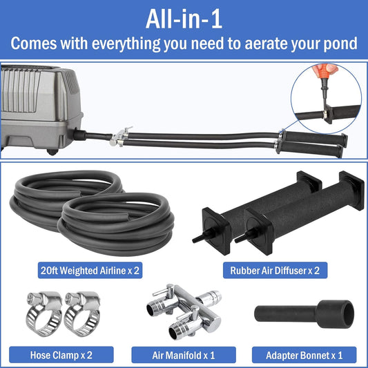 Pond Aeration Kit|Linear Aeration Pump Kit| Koi Pond Aerator | For Pond up to 5000 Gallons 1.06CFM 4.35PSI 18W| Includes One 20ft Rubber Airlines and Diffusers