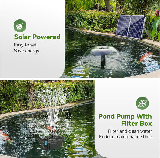 NFESOLAR Pond Filter Fountain with 50W Solar Panel, 580 GPH Water Pump, 10 FT Extension Cord, Solar Fountain Pump with Pond Filter Box Outdoor for Koi Ponds Water Feature Waterfall Pool