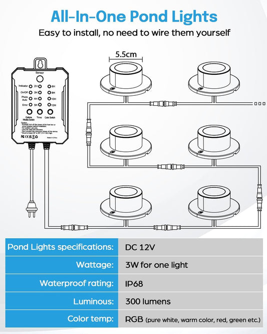 HIBOITEC LED Pond Lights, RGB Underwater Fountain Light with 12V Timer Transformer, Photocell Light Sensor, IP68 Waterproof Outdoor Underwater Lights for Outdoor Ponds Garden, 6 Pack