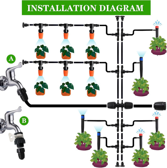 226FT Greenhouse Micro Drip Irrigation Kit Automatic Irrigation System Patio Misting Plant Watering System with 1/4 inch 1/2 inch Blank Distribution Tubing Hose Adjustable Nozzle Emitters Sprinkler