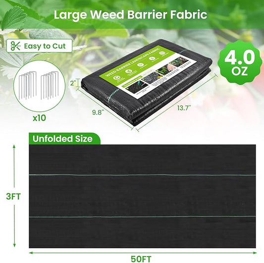Weed Barrier Fabric, 3x50ft Landscape Fabric, 4oz Heavy Duty Durable Woven Geotextile Fabric, High Permeability Ground Cover Mat, Driveway Fabric, Garden Weed Control Cloth with 10 U-Securing Pegs