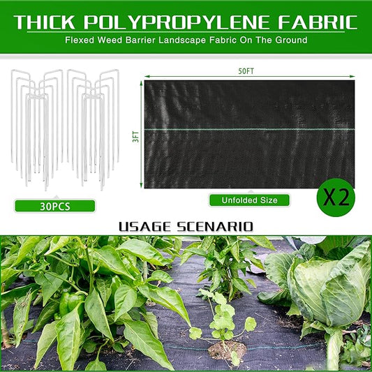 3FT x 100FT Weed Barrier Landscape Fabric Heavy Duty, 3.2oz Premium Gardening Weed Control Mat with 30 U-Shaped Securing Pegs, Ground Cover for Gardening, Farming, Raised Bed(2 Packs 3x50FT)