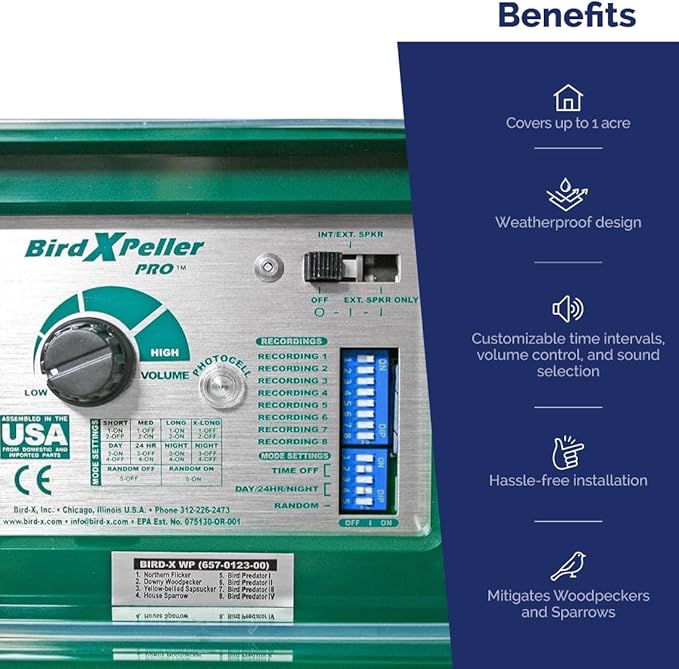 - Easy Installation: An ultimate bird preventer, the Woodpecker PRO can easily be mounted anywhere using the provided hardware. Highly customizable and easy to use, our device allows you to change the frequency, volume, direction, and hours of operation.