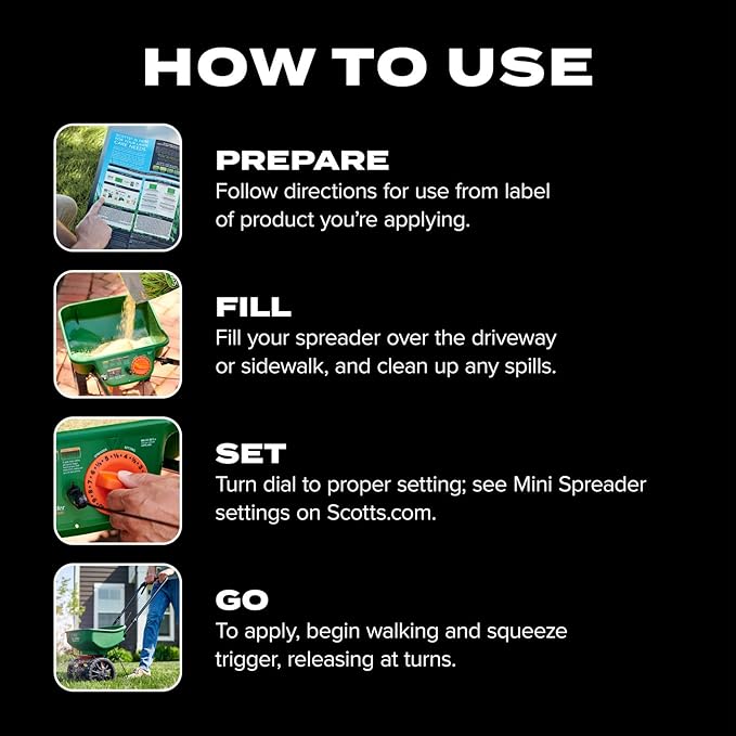 - Capacity: Holds up to 5,000 sq. ft. of Scotts lawn product, including grass seed, fertilizer, salt and ice melt