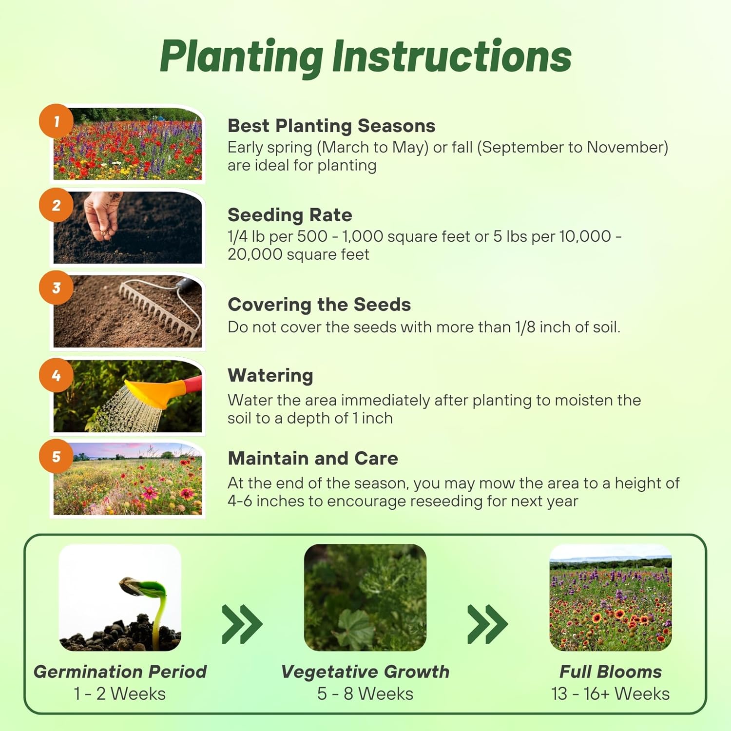 - EASY PLANTING AND COVERAGE: Our seeds can be easily broadcast or drilled into the soil at a depth of up to ยผ inch. With a sowing rate of 1/4 lb per 500-1,000 square feet, this mix provides generous coverage for various garden sizes, making it simple to create beautiful wildflower displays with seeds for planting flowers.