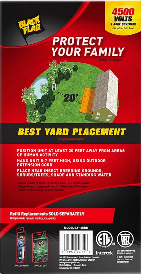 - Wide Coverage: This outdoor mosquito zapper provides an impressive 1 acre coverage, making it an excellent bug zapper indoor/outdoor. Whether it's for your home, patio or business, this bug zapper indoor outdoor provides efficient coverage.