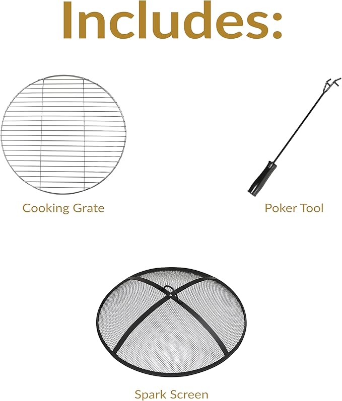 - SERVE UP DELICIOUS FOOD: This round fire pit includes a sturdy, spark screen for added safety from flying sparks, a poker stick tool to easily control the flame, a built-in wood grate for better airflow, and a BBQ cooking grate so you can cook delicious food in the backyard or while camping.