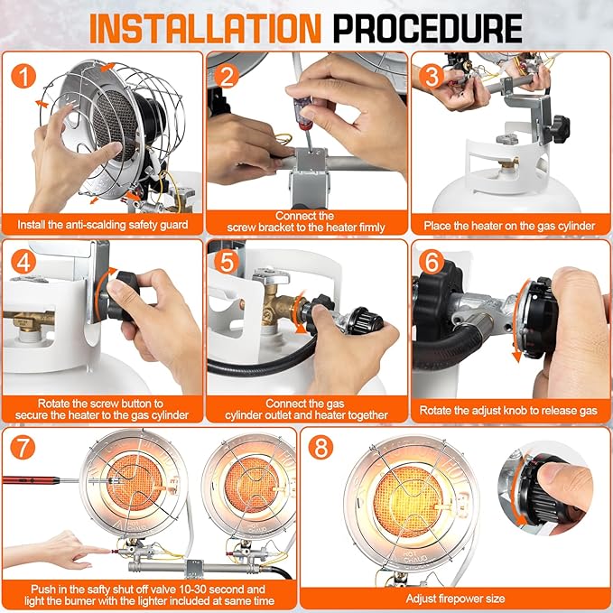 - 🔥【Easy to use Propane Patio Heater】The propane heater comes pre-assembled and can be easily attached to a 20 lb propane tank (not included) using the mounting bolt knobs. To ignite, press the safety shut-off valve and insert the included USB lighter through the ignition hole in the metal plate for a quick and safe start. Our propane heater is an ideal gift for outdoor enthusiasts, patio, garage, camping, RV travele.