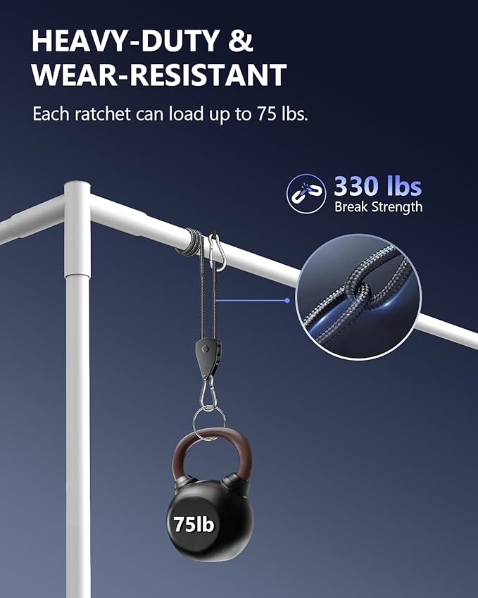 - Built to Last: The ratchet straps are durable, tear-resistant, and rust-proof with a weight load capacity of up to 75 lbs per ratchet and 150 lbs per 2-pack