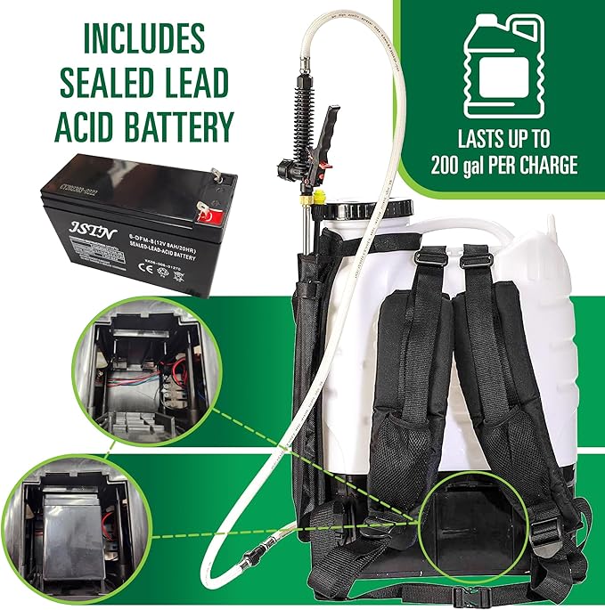 - ADVANCED BATTERY TECHNOLOGY FOR RELIABLE PERFORMANCE: When you're out in the garden or tackling a big lawn project, you need a sprayer that keeps up. The MY4SONS M4 4-Gallon Backpack Sprayer comes equipped with a rechargeable lead acid battery, offering up to 150-200 gallons of spray per charge. With its intuitive indicator lights and DC charger, youâve got reliable power for all your spraying needs, whether you're fertilizing your garden or taking care of the yard.