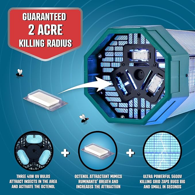 - 2 METHODS OF ATTRACTION | 2-in-1 Design Attracts & Eliminates Many More Bugs by Utilizing Multiple Luring Techniques! Watch as the Lantern Draws in Flying Pests with [3] of Our Powerful 40W Ultraviolet Light Bulbs PLUS [2] Liquid Octenol Cartridges | When Warmed & Vaporized by the UV Lamp, Octenol Mimics Ruminant Animals’ Breath/Odor for Maximum Catch & Kill | Covers 2 Acre Wooded Areas, Backyard, Patio, Deck, Porch & Farm