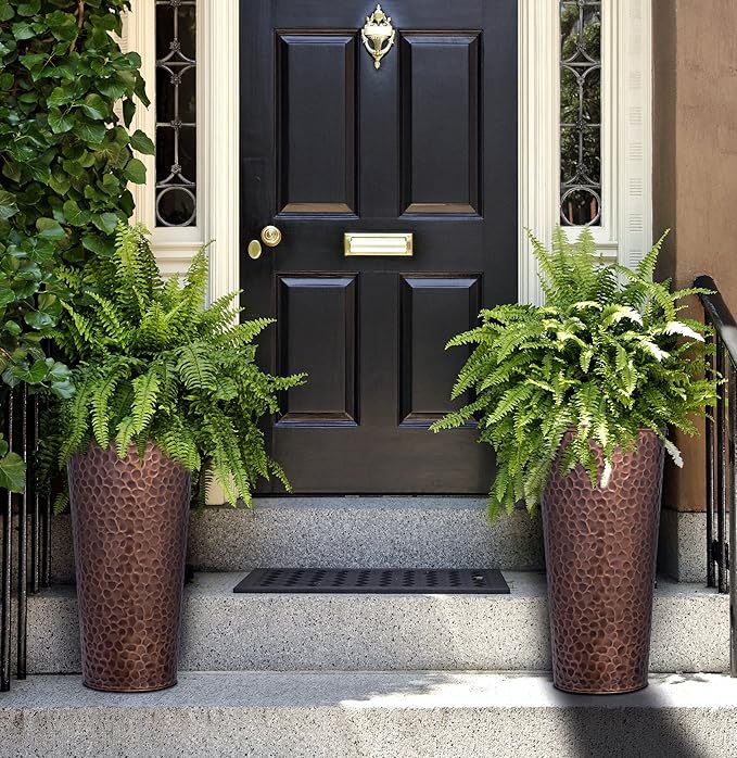 - Handcrafted tall decorative planter – Stainless steel, hand-hammered, with antique copper finish and clear-coat lacquer. Each planter is unique, no two are alike. This indoor outdoor garden planter is solid and durable, yet light weight to move easily. Purchase a pair to grace your entryway and connect with the outdoors or place outdoors on your patio, deck, or outdoor room. This home décor accent is designed to add character to your living space, indoors or out.