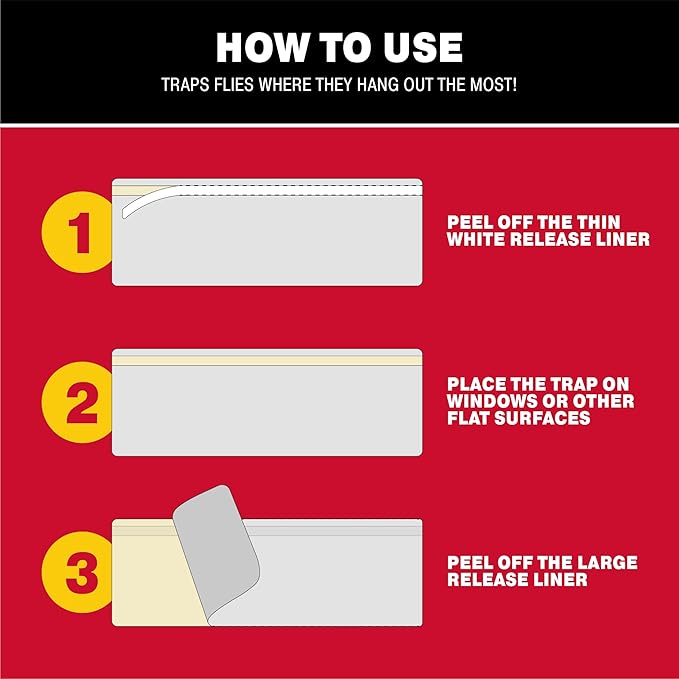 - READY TO USE: Bug & Fly Clear Window Traps are waterproof, easy-to-apply, disposable, and non-toxic. For best use, peel off the thin white lining and stick bug and fly trap to window, remove the rest of the lining and let the trap take care of your flying insect problems! Our products are tested under the harshest field conditions to ensure maximum reliability for any level of pest control expert.