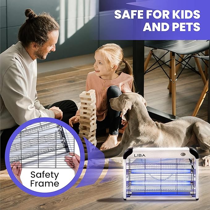 - SAFETY: The Liba zapper comes with a safety screen to prevent from small fingers getting inside the device. Two replacement bulbs are included with every zapper in case a replacement is needed. Each zapper has an easy on and off switch at the top right and a five-foot cord for convenience and distance.
