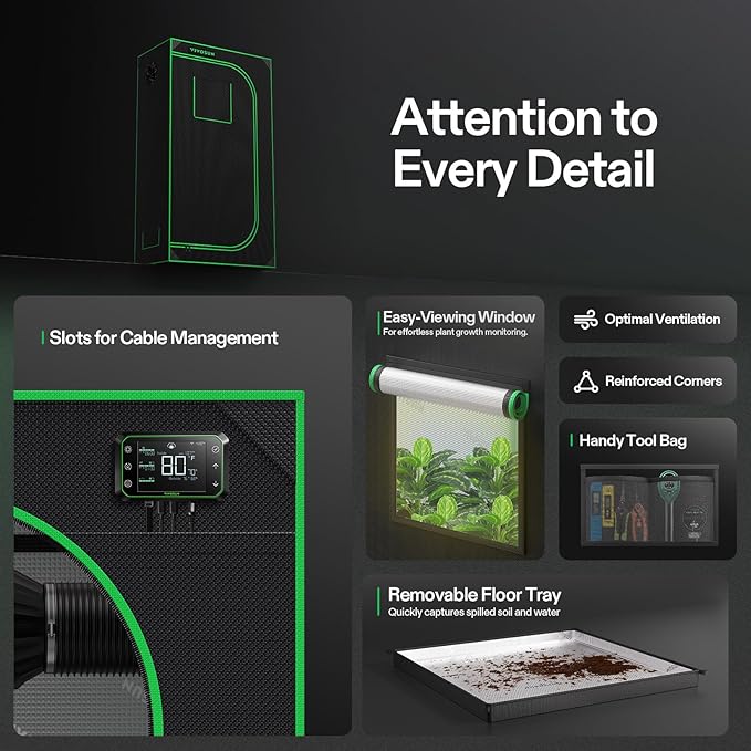 - Easy Observation & Maintenance: With a visible window made by transparent plastic set on the grow tent, you can check the growth status of your plants at any time; The window at the bottom is helpful for heat dissipation; The hook and loop fasteners on the cover of the window are easier for you to open and observe inside; It is also equipped with a removable floor tray that is convenient to be cleaned and conserved