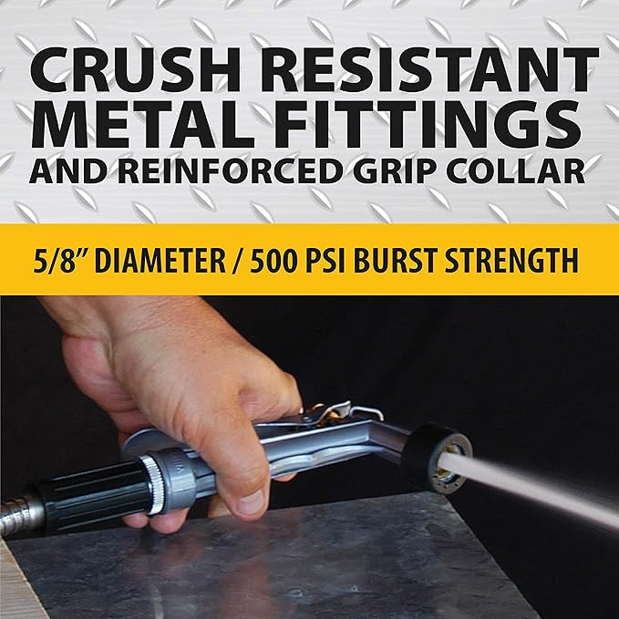 - Kink Free: The body of the hose is encased in a sturdy stainless-steel outer layer allows for a consistent, steady and high-pressure water output yet is memoryless, meaning it will lay flat, resist kinks, can coil easily and store effortlessly