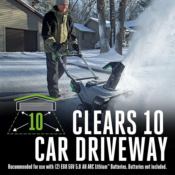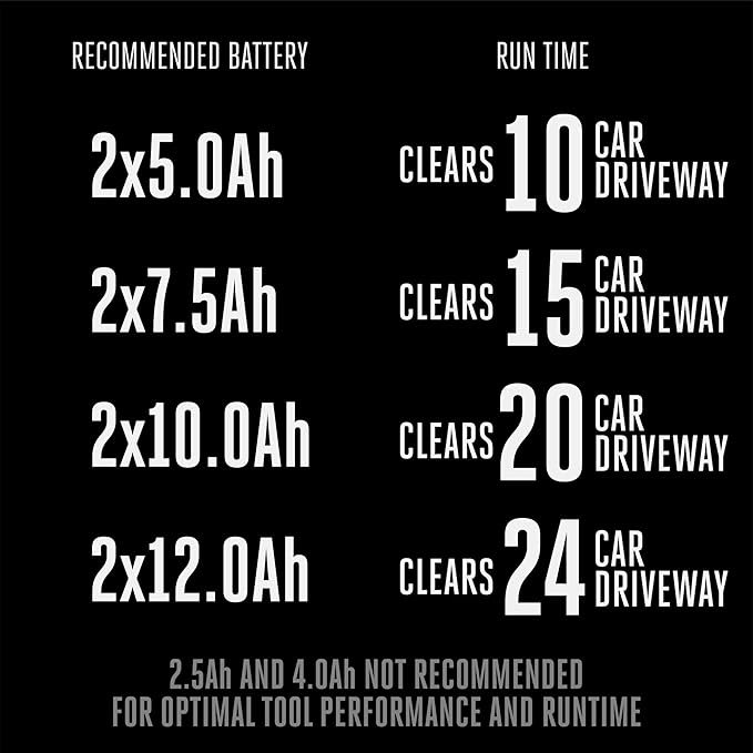 - Clears a 10-car driveway with 8 inches of snow on a single charge when used with the two recommended 5.0Ah ARC Lithium batteries (available separately)