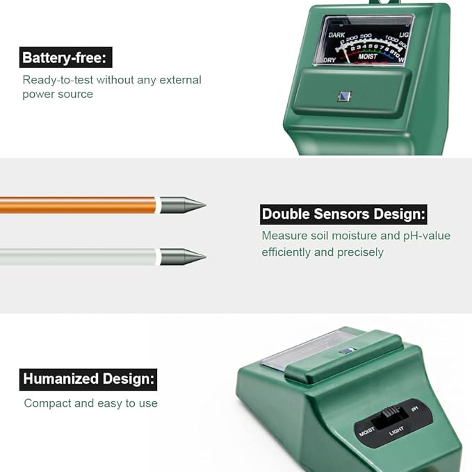 - NO BATTERY NEEDED: Simply insert the meter into soil, wait few minutes, accurate test results will be displayed on the readout panel. No battery is needed.