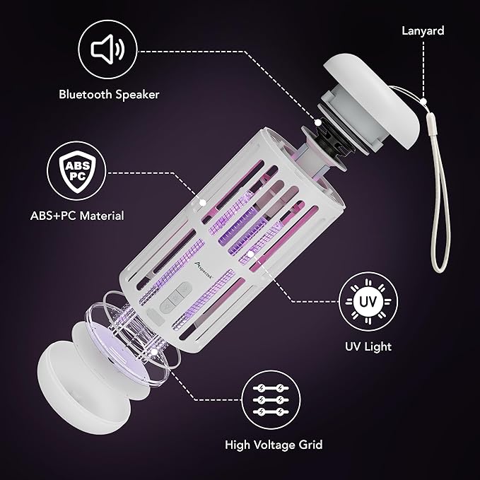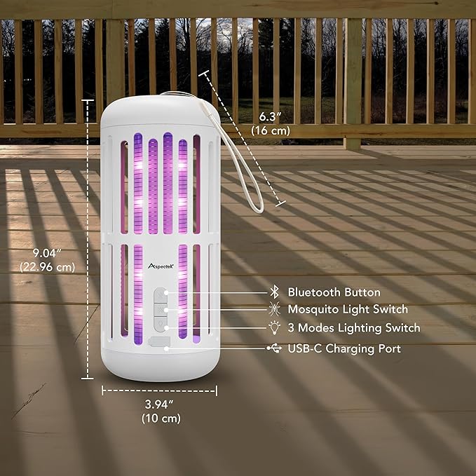ASPECTEK Portable Bug Zapper with Bluetooth Speaker – Rechargeable LED Mosquito Zapper and Ambient Light, Cordless Insect Device for Indoor/Outdoor Use, Patio, Camping, Garden – 3-in-1 Design