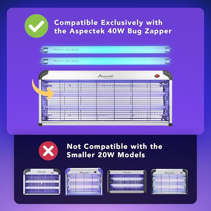 - 2-pack replacement bulbs for 40W zappers – Includes two 20W UV light tubes designed to operate together in ASPECTEK 40W bug zappers. Not compatible with 20W models.
