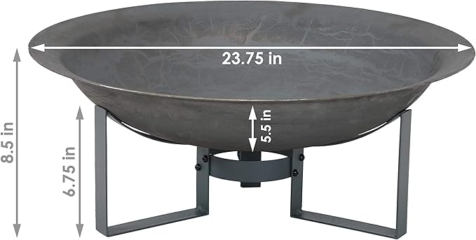 - LIGHTWEIGHT AND PORTABLE DESIGN: This outside firepit has a 23.75" diameter and measures 8.5" tall. It weighs 12.4 pounds. The fire bowl measures 23.75" in diameter x 5.5" deep x 3.5 millimeters thick. The stand is 6.75" tall.