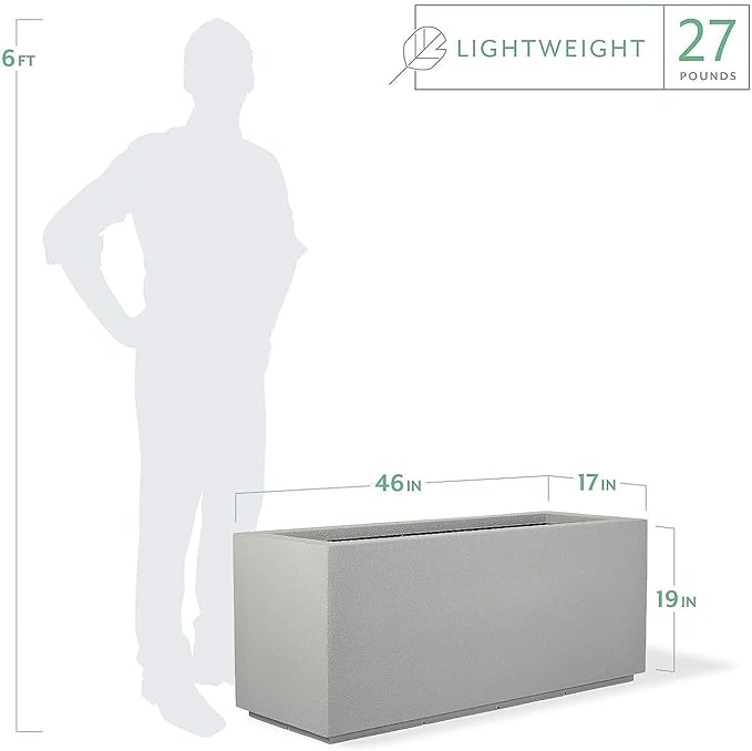 - FEATURES/DIMENSIONS: 46L x 17W x 19H tall planter equipped with drainage holes and exit channels. Suitable for indoor or outdoor use. Due to pre-drilled drainage holes, faux plants are recommended for indoor use.