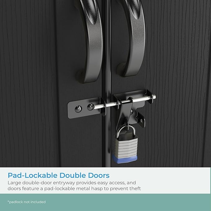 - PAD-LOCKABLE DOUBLE DOORS: Large double-door entryway provides easy access to stored belongings, and the doors feature a pad-lockable metal hasp to prevent theft and unauthorized use (padlock not included)
