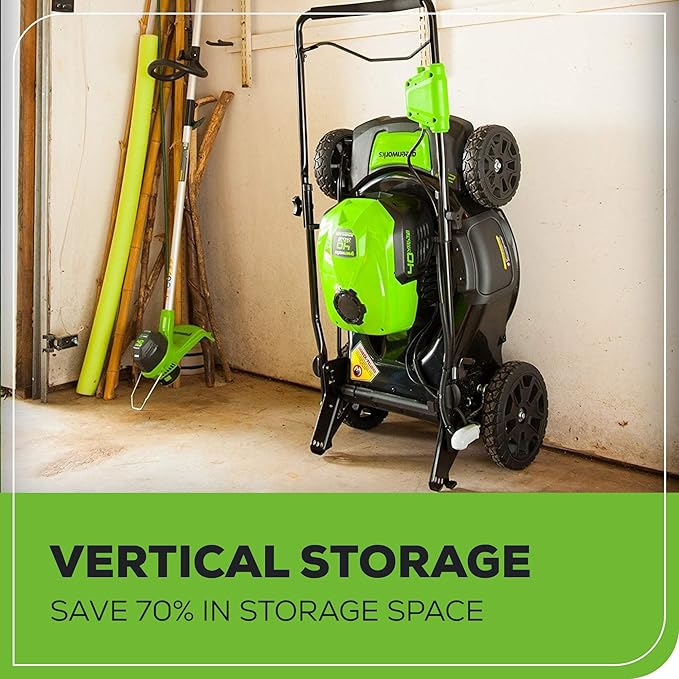 - 3-In-1 design allows you to mulch, rear bag, or side discharge your grass clippings. Use up to 70% less space in your garage with the vertical storage feature