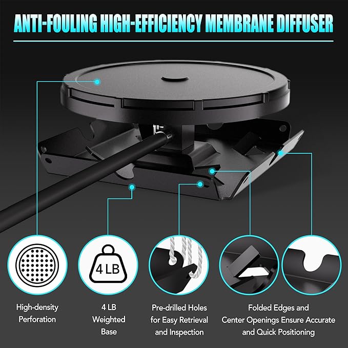 - EPDM non-stick 10” membrane diffuser. 12” square stainless steel base for the diffuser’s stability.