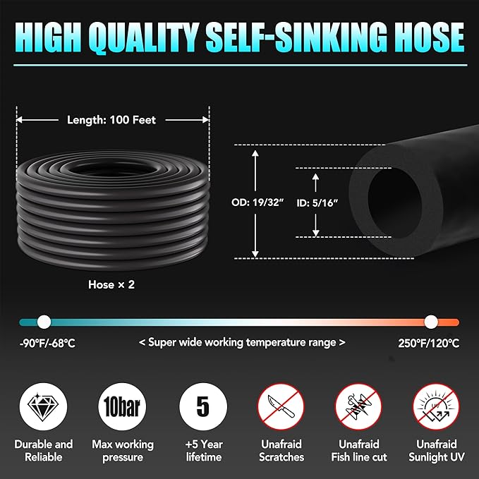 - 100ft, 5/16" ID, 5/8" OD self-sink rubber air hose Two roll. 10 hose clamps, 1 tee brass barb fitting, 2 straight barb fittings included.