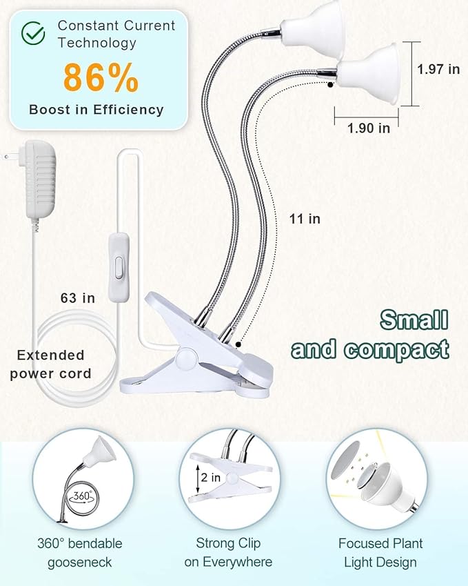DOMMIA Grow Lights for Indoor Plants,Full Spectrum Grow Light with Warmwhite Red LED,Dual Head Clip Plant Light for Indoor Plants,Manual ON/Off Switch,Adjustable Gooseneck Plant Light for Houseplants