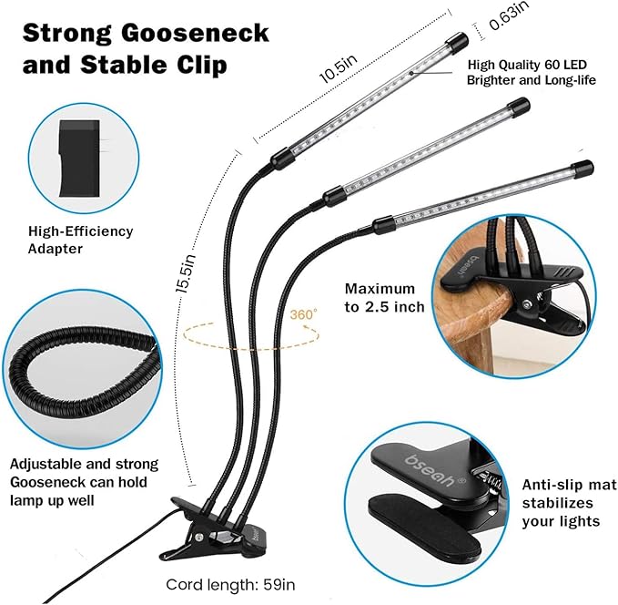 bseah Grow Light Plant Lights for Indoor Plants, Clip-On Full Spectrum Plant Grow Lights, Auto ON & Off Timer 3/9/12H, Dimmable Brightness & 3 Light Modes