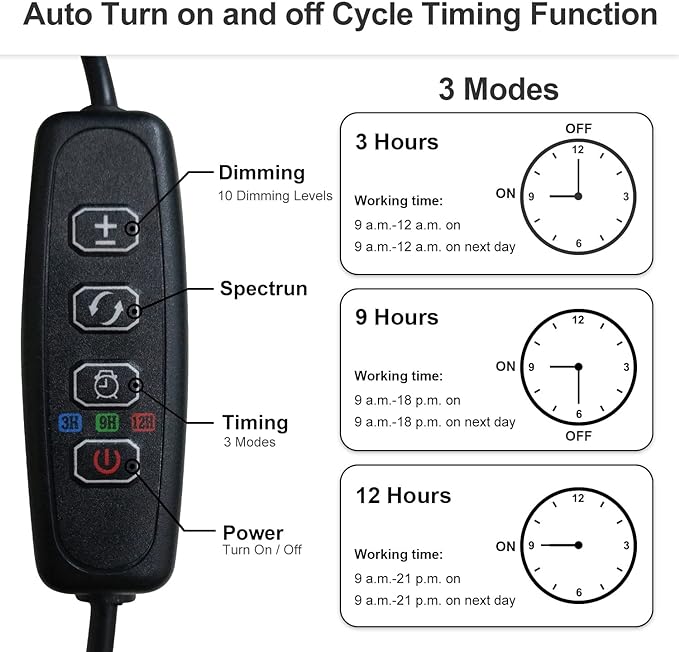 - Auto On/Off Timing Function: Set up once, the grow light will turn on and turn off automatically at the same time every day for 3/9/12 hours.