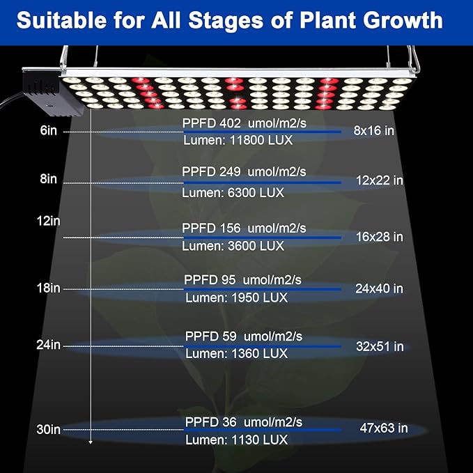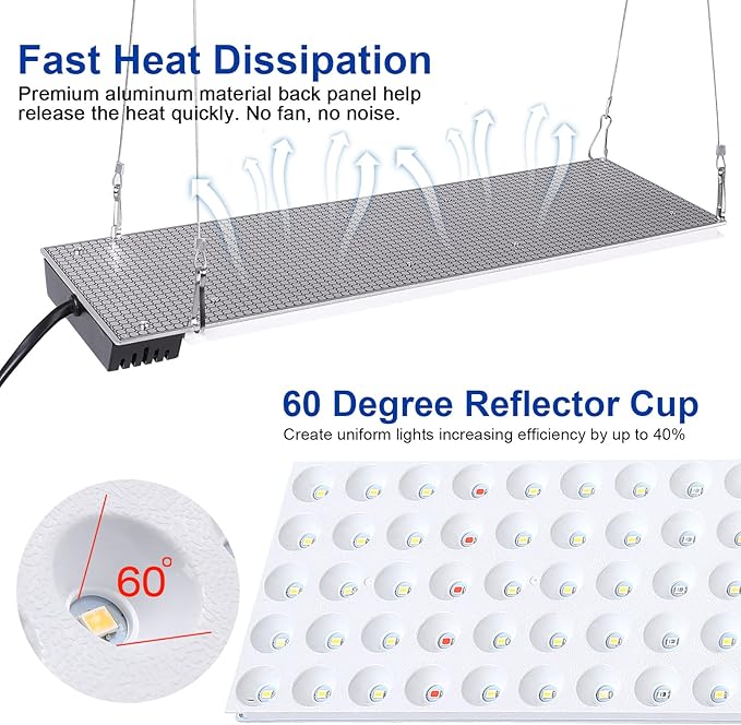 - 【High Efficiency】Our LED plant light features a 60 degree reflector cup that produces uniform light, increasing efficiency by up to 40%. The aluminum material allows for fast heat dissipation, without the need for a fan, making it quiet and durable. It is also compact and lightweight, making it easy to install and move around
