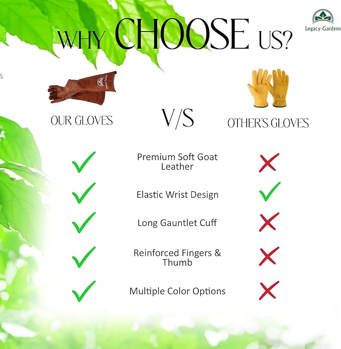 - Thorn Resistant Leather Garden Gloves - Crafted with A-grade goatskin leather for exceptional puncture resistance, these long gloves keep your hands secure from rose thorns, rough rocks, and prickly plants. Ideal for rose pruning and yard work.
