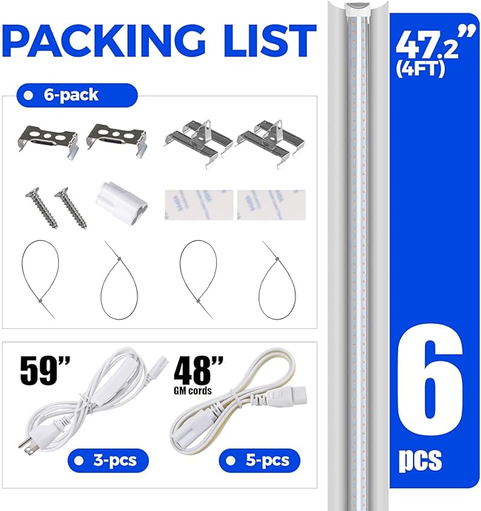 - What You Get: 6 x Barrina LED Grow lights, 3 x Power cords with ON/OFF switch, 5 x Connecting Cords(48''), 6 x Small Connectors, 24x Installation Clips, 12 x Tapes, 24 x cable ties