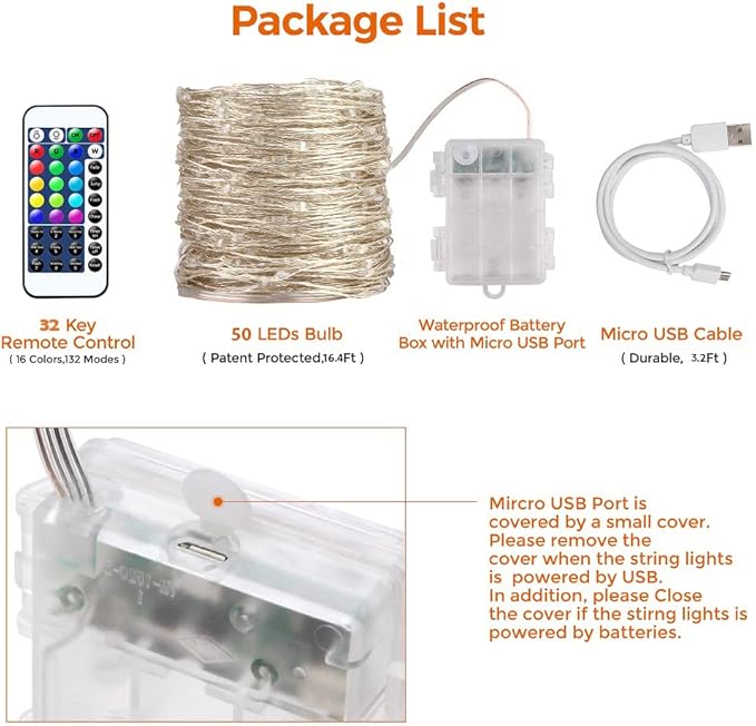 - Battery Operated & USB Powered:The outdoor string lights come with an (IP65 rating) waterproof battery box and USB cable. It can not only used by 3 AA batteries but also run via USB adapter or power bank or computer, which provides more possibilities and suitable for more occasions.