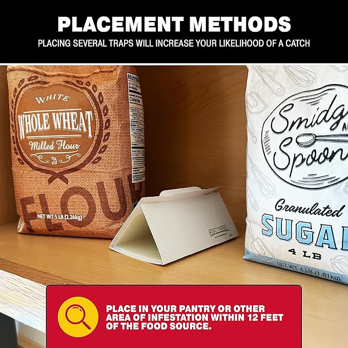 - EASY TO USE AND MADE IN THE USA: Conveniently designed and ready to use, just place the pheromone attractant in the designated box on the glue trap and place the moth and bug sticky traps near food storage areas. The attractant radius reaches and lures moths within 12 ft. of infested food.