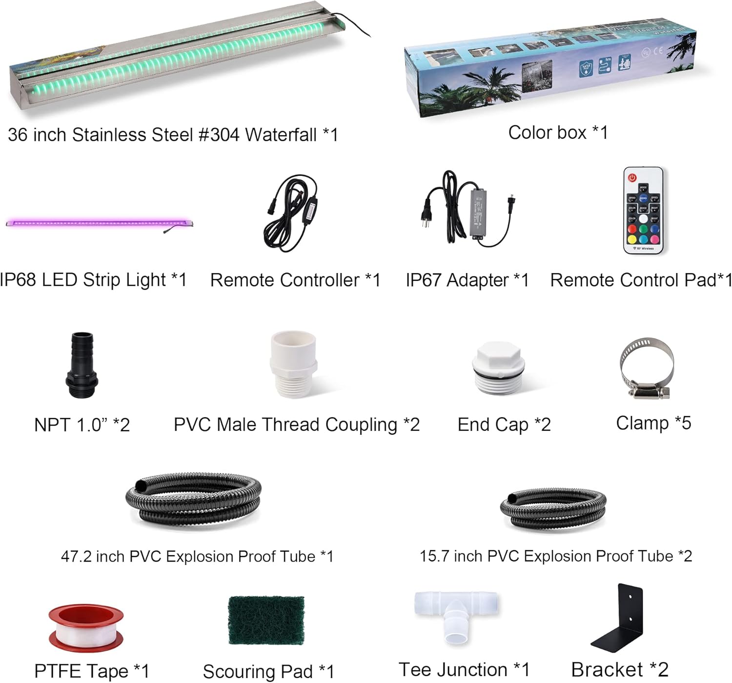 - Great Decoration - LED-lighted waterfall spillway makes your garden elegant, fashionable, and beautiful. The color changed as you like with the gentle sound of water running make your patio more special at night. It comes with a 304 stainless steel spillway, IP68 LED strip, IP67 adaptor, RF remote, supply cord, and 1.2β female PVC pipe adapter