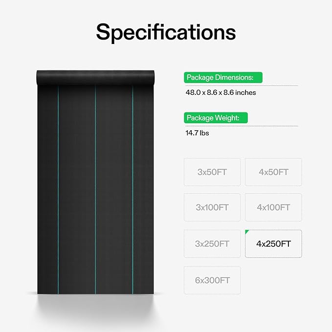 - Easy to Set Up: Our heavy-duty garden fabric mat is 4 ft. in width by 250 ft. in length, and you can cut it to whatever size you need; When youโre done adjusting the size, just lay the fabric down on the ground; The cut edges fray less and unravel less because of its special construction