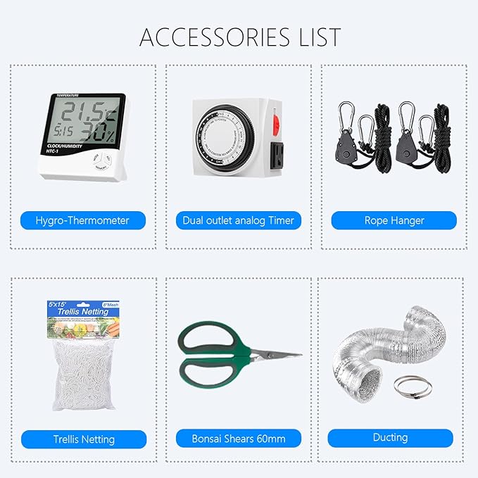 - This Full Setup Kit includes LED grow light, grow tent,inline duct fan ,carbon filter, 25ft length flex ducting,duct clamps, humidity thermometer,shear, Trellis Netting, time, adjust rope hangers.This is a grow tent kit package almost with everything you may need and best for beginners. And it would bring you a wonderful growth experience.