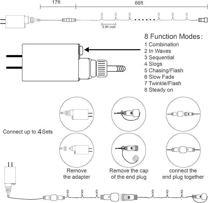 - 8 Lighting Functions: Our Halloween string lights have 8 lighting modes: combination, in waves, sequential, slogs, chasing/flash, slow fade, twinkle/flash, and steady on. Fit different occasions, moods, feelings, holidays, festivals, anniversaries, etc. Pressing the round button on the transformer to change the lighting modes.