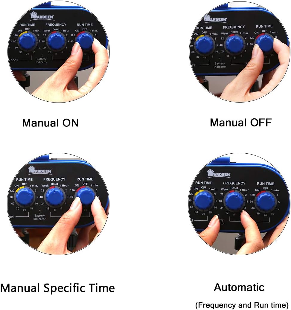 - MINI WATER TIMER: This garden hose timer is designed 2 separate valves with maximum flexibility settings. Customize each hose with its own watering duration and frequency according to your precise needs. Use one water timer to control watering your lawn and garden