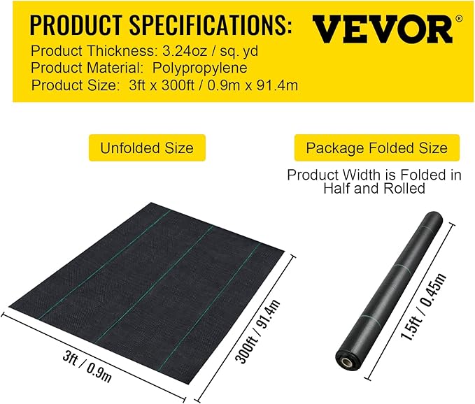 - Durable PP Fabric: This 3.24 oz landscape weed barrier fabric measures 3 ft wide and 300 ft long. The heavy duty weed barrier is here to fully cover 900 sq. ft area, making your life easier and 100% hassle-free. It protects your garden and flower beds from weeds, highly increasing your productivity and efficiency.