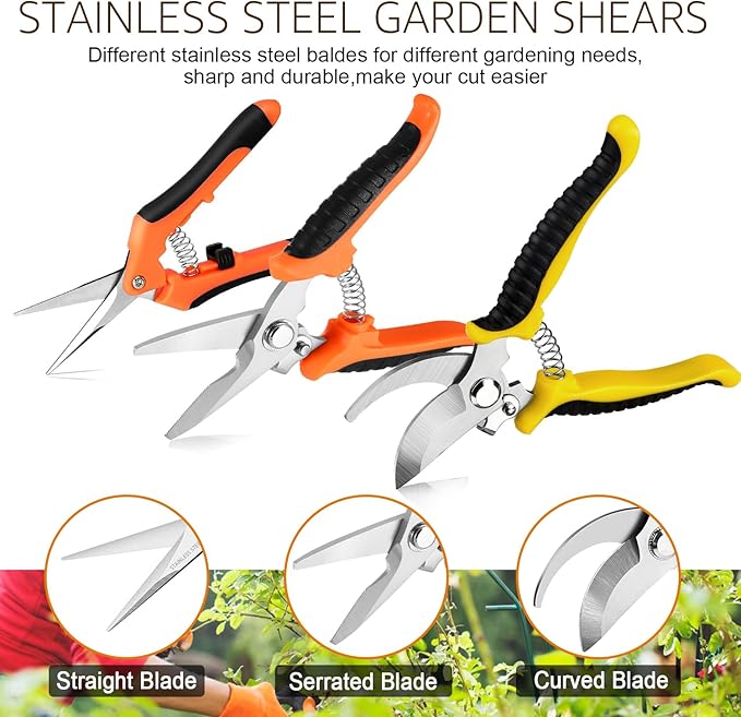 - Make Pruning Work Easier: Rust-resistant stainless steel blade are sharp and durable for easy and smooth cut.Anti-slip and ergonomic handle make the gardener clippers more comfortable in your hand.Easy-open spring action reduces hand fatigue while cutting. you can easily to cut without damaging the vital stems and branches of your plants